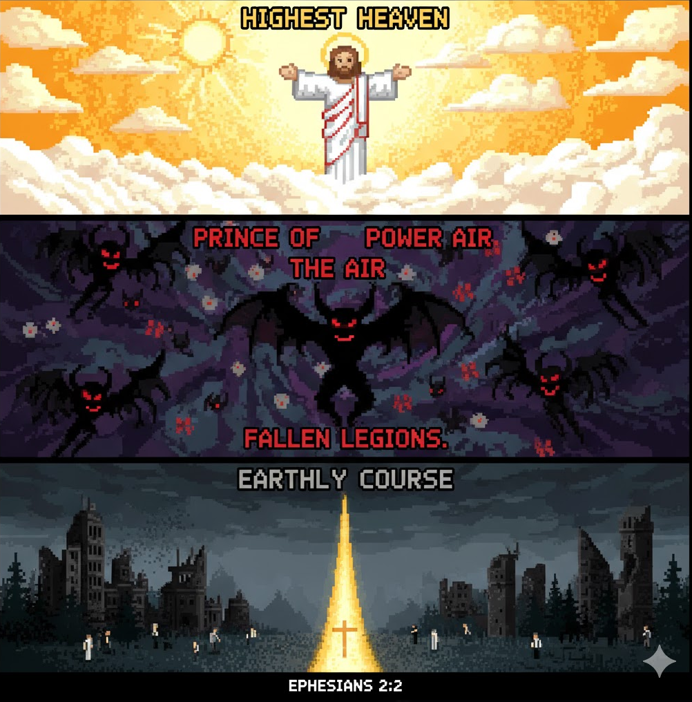 This cosmic model illustrates the spiritual war against "the rulers, against the authorities, against the cosmic powers over this present darkness" (Eph 6:12).